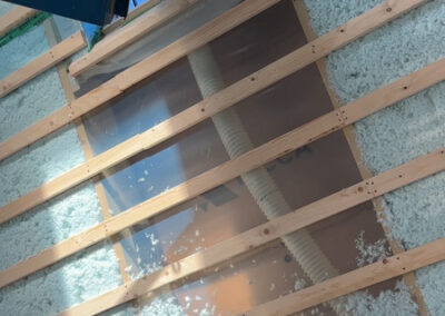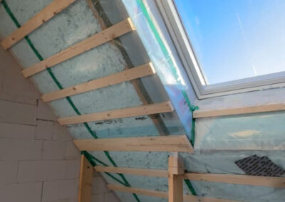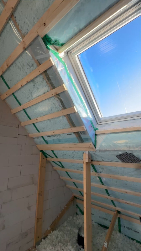 Kärnan i vår lösning var att använda ett smartare tätskikt. Istället för traditionella metoder monterade snickarna den variabla ångbromsen Vario Xtra. Detta möjliggjorde en helt ny typ av uppbyggnad där luftspalten kunde väljas bort. Resultatet? Betydligt mindre arbete för snickarna och utrymme för en tjockare, mer effektiv isolering som sprutades direkt mot råsponten.