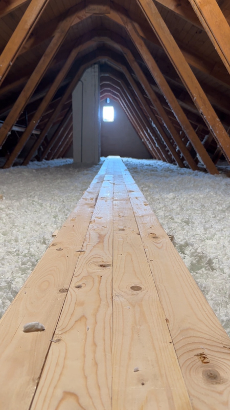 • Landgång: Möjliggör säker förflyttning och framtida besiktning av vinden samt åtkomst till installationer och infrastruktur utan att påverka isoleringens funktion.